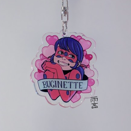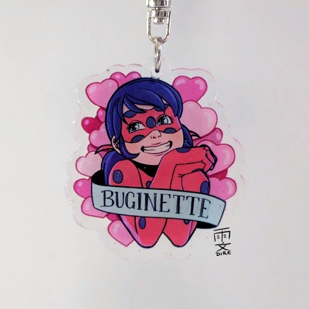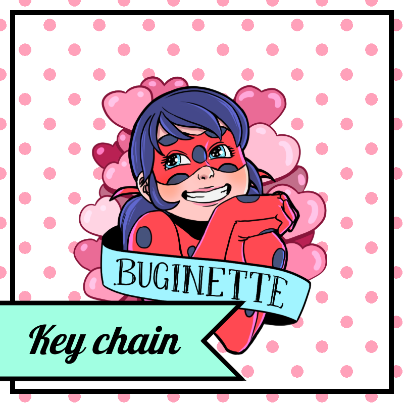 2" Acrylic key chain featuring Ladybug from Miraculous Ladybug. Double sided. Double board acrylic with glitter epoxy on one side.
