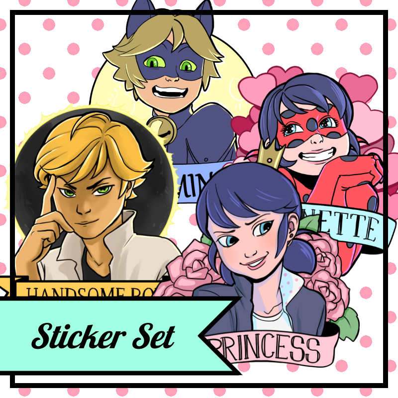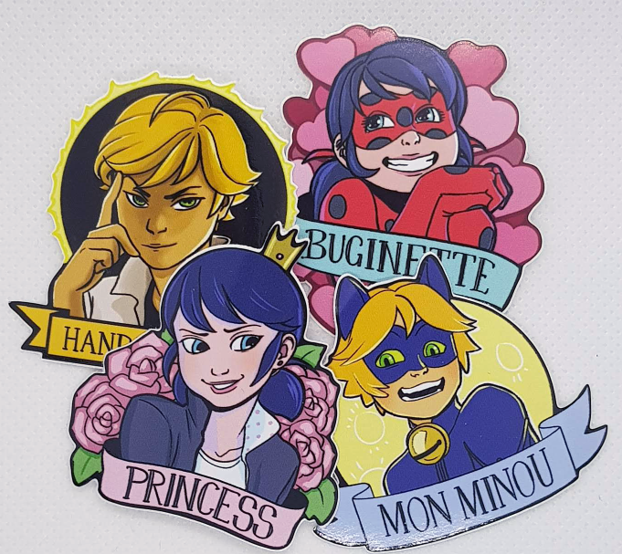 Die cut sticker set of Adrien, Marinette, Ladybug, and Chat Noir.