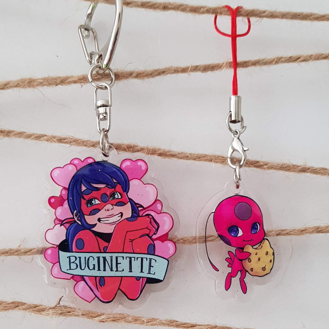 2" Acrylic key chain featuring Ladybug and 1.5" acryllic charm featuring Tikki from Miraculous Ladybug. Double sided. Double board acrylic with glitter epoxy on one side.