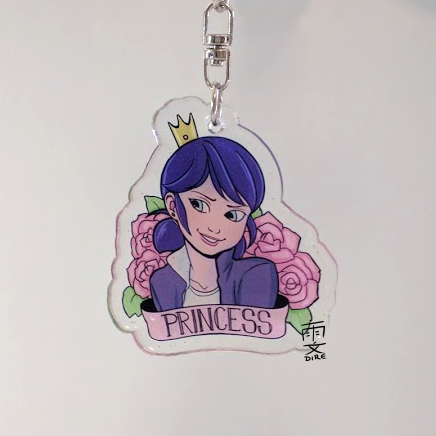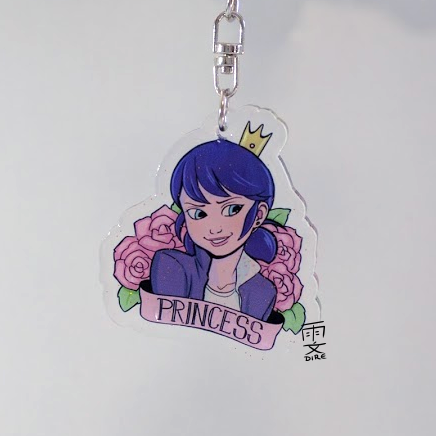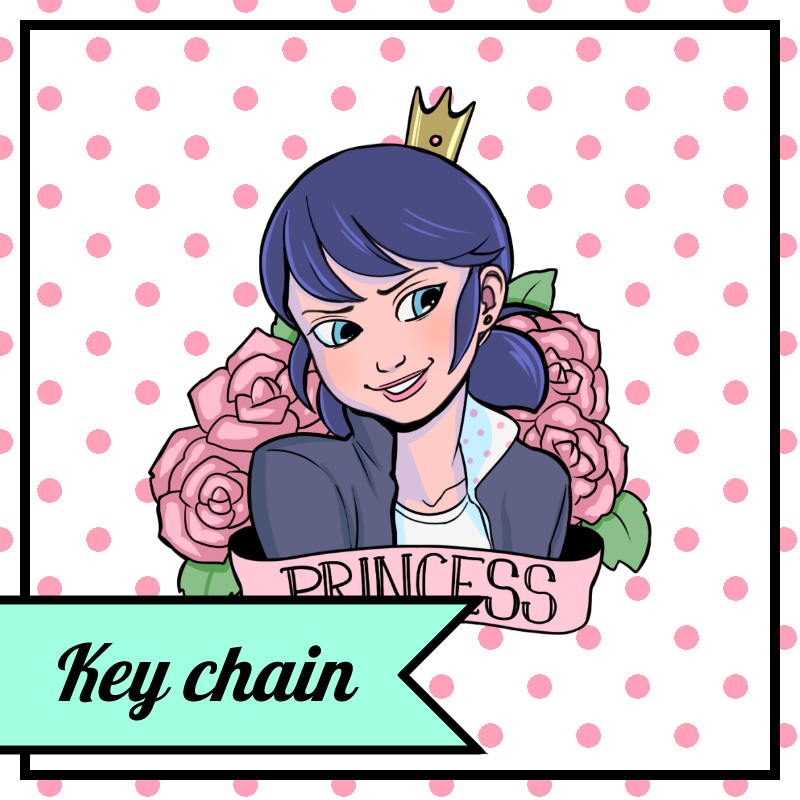 2" Acrylic key chain featuring Marinette from Miraculous Ladybug. Double sided. Double board acrylic with glitter epoxy on one side.